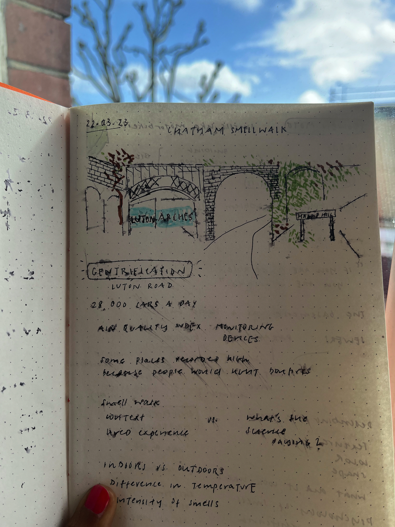 I accompanied Dr. Kate McLean, in one of her scouting smell walks serving as an initial step for an extensive study into correlations between air quality and gentrification in the area (Luton Smell Walk, 22/3/23). During our journey and smell walk exercise, I picked up tidbits of information on registering and recording smells, the need to involve locals for understanding the lived experience of a place, and the nuances of creating a study revolving around the senses.