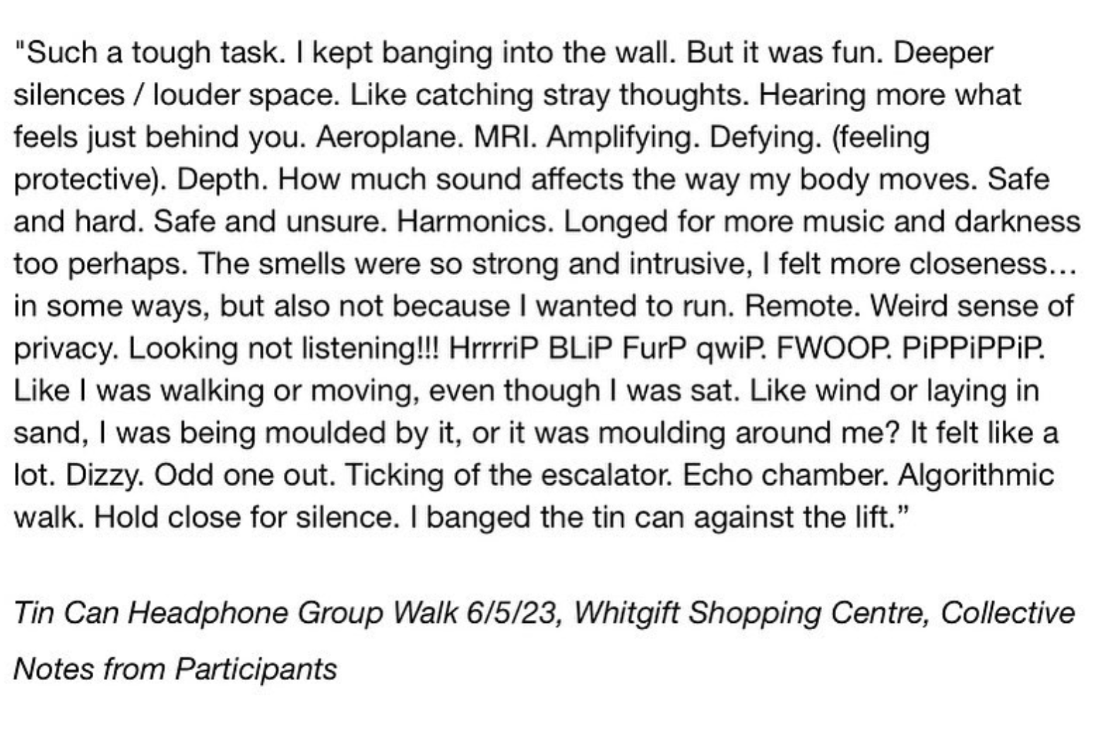 I participated in an open-ended sensory walk organised by Katherine Smith in Croydon (Tin Can Headphone Walk, 6/5/23, Whitgift Shopping Centre). Wearing tin cans around our ears to amplify auditory stimuli, the participants walked through a shopping center, noting our feelings and perceptions of the space. Reflecting back on the experiences shared by the group at the end of the walk, particularly those shared by neurodiverse participants, made me realise the extent to which our common sensory experiences can be interpreted in varied and subjective ways.