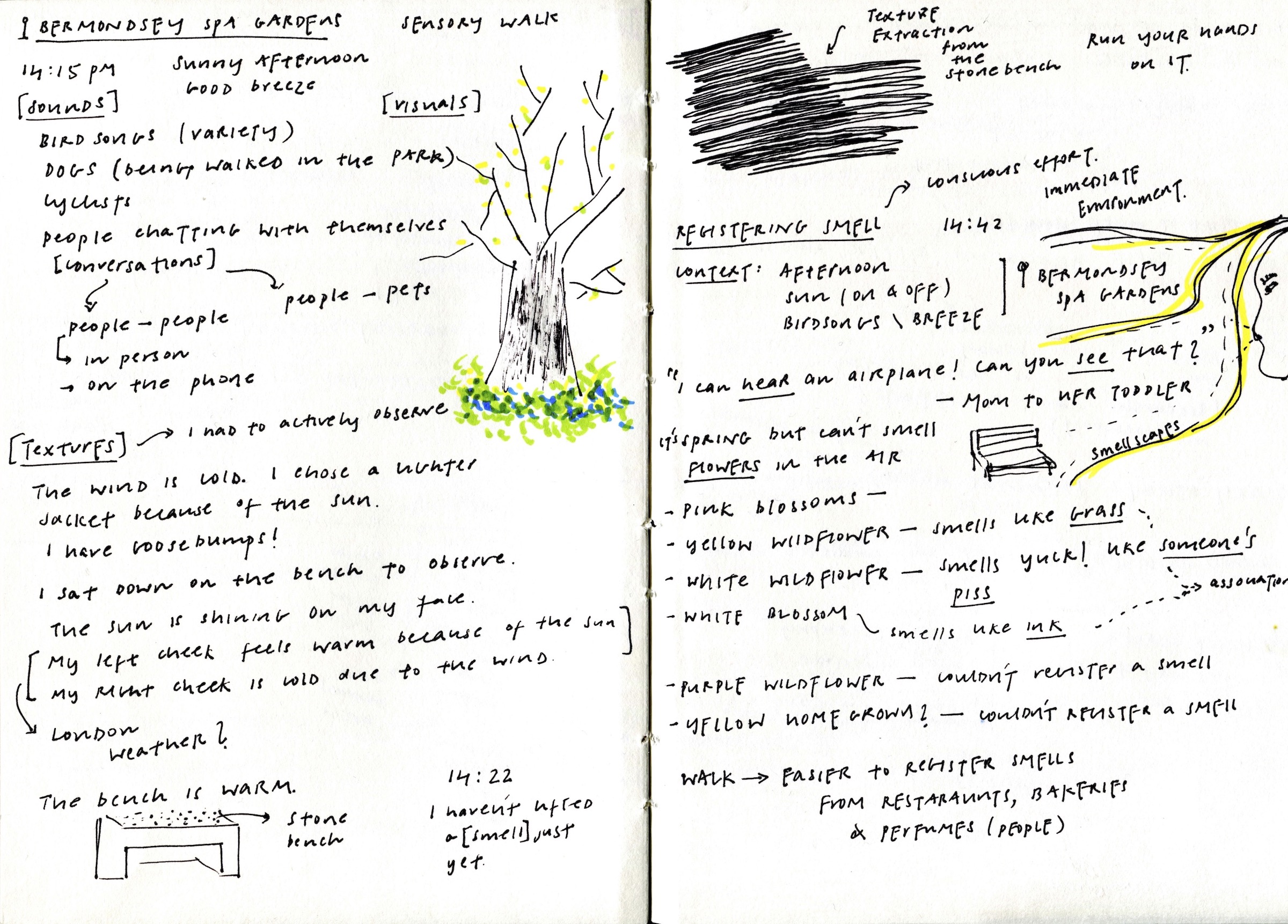 As an experiment, I undertook a personal sensory walk in Bermondsey Spa Gardens to better understand the complexities of detecting and recording new sensory experiences.